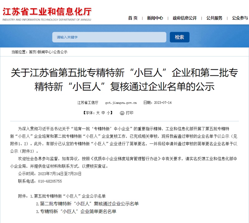 近日,江蘇省工信廳發布《關于江蘇省第五批專精特新“小巨人”企業和第二批專精特新“小巨人”復核通過企業名單的公示》。我們南通超力卷板機制造有限公司上榜第五批國家級專精特新“小巨人”企業名單。